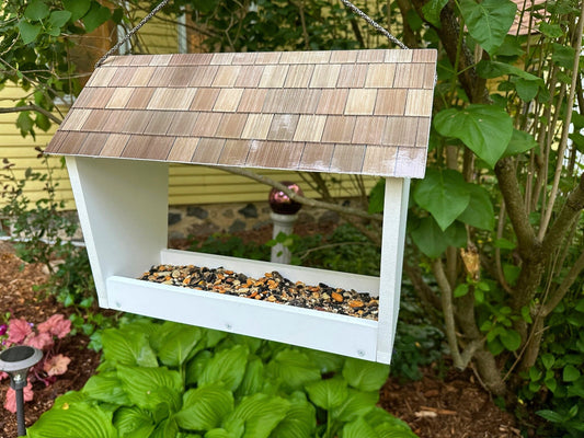 Beautiful hanging or post mounted Bird Feeder Solid Building Grade PVC Lasts Years