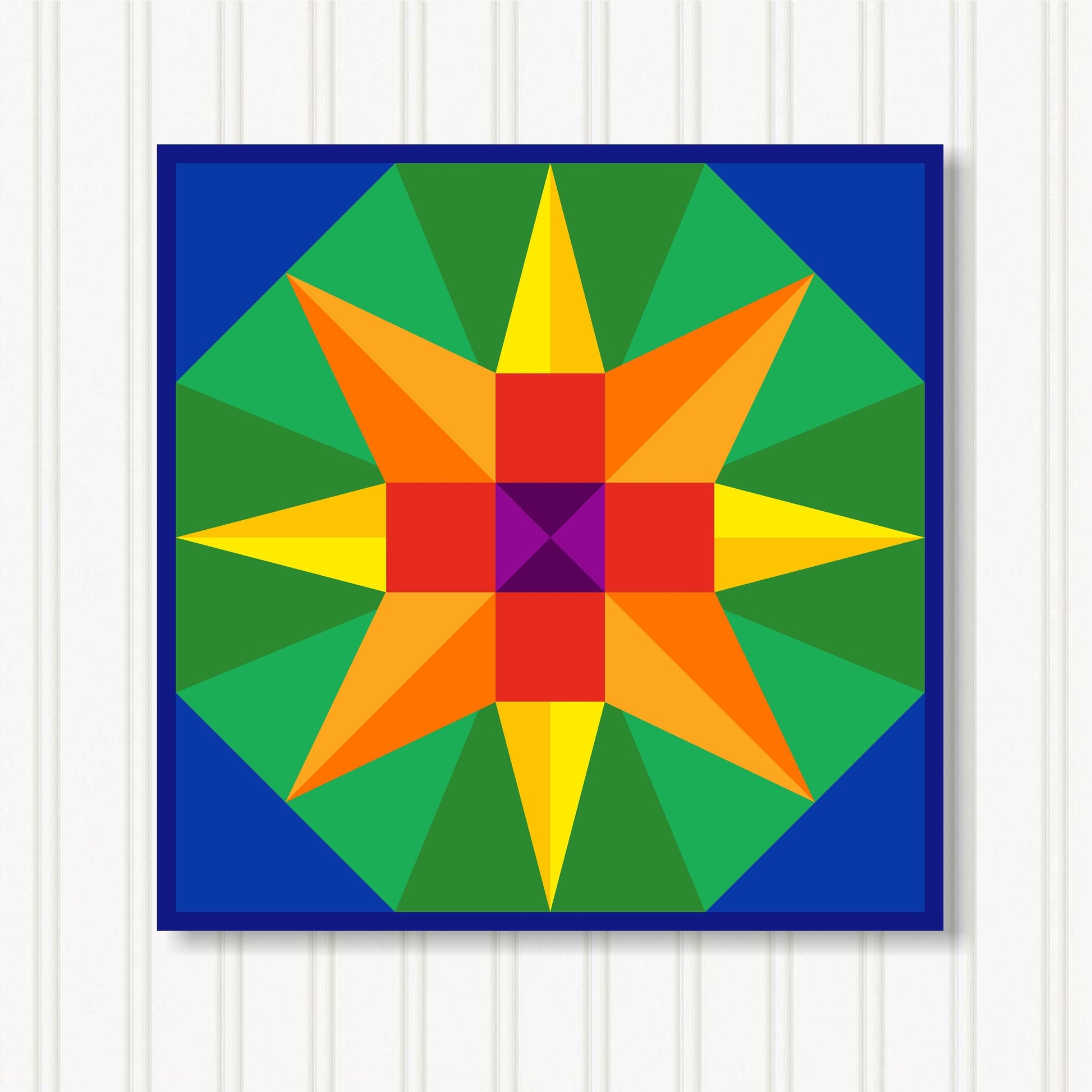Our indoor barn quilts are crafted from 3/4" particle board which makes them thick and sturdy. The Barn Quilt Indoor Canvas Squares and printed with UV Ink on archival canvas that creates a beautiful satin finish. The canvas is stretched around the board and finished with museum quality edges. We include hangers on the back of our barn quilt canvases for mounting them on the wall.