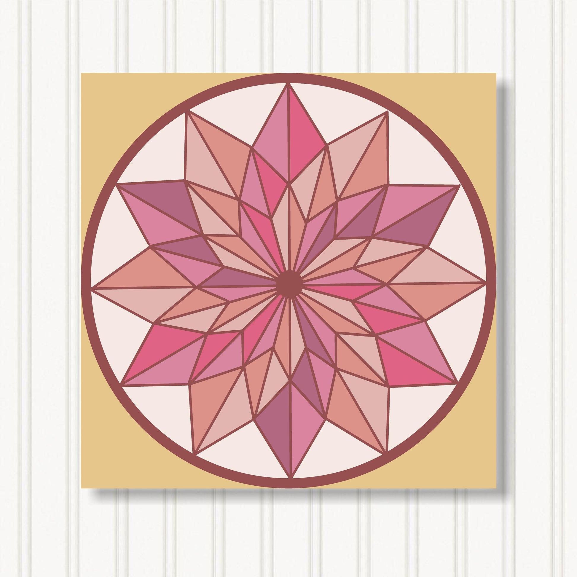 Our indoor barn quilts are crafted from 3/4" particle board which makes them thick and sturdy. The Barn Quilt Indoor Canvas Squares and printed with UV Ink on archival canvas that creates a beautiful satin finish. The canvas is stretched around the board and finished with museum quality edges. We include hangers on the back of our barn quilt canvases for mounting them on the wall.