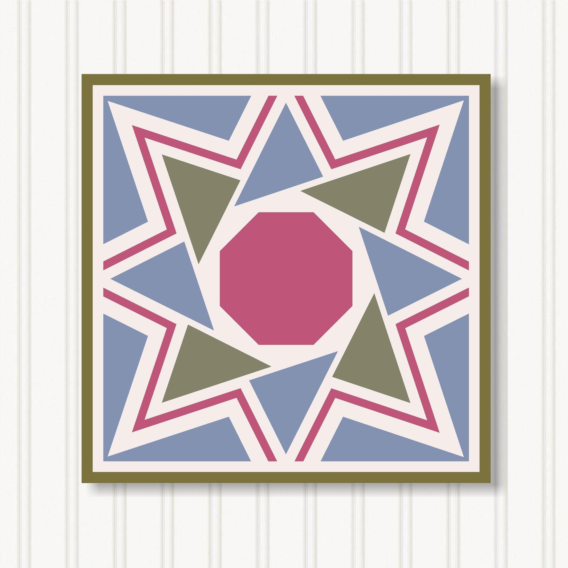 Our indoor barn quilts are crafted from 3/4" particle board which makes them thick and sturdy. The Barn Quilt Indoor Canvas Squares and printed with UV Ink on archival canvas that creates a beautiful satin finish. The canvas is stretched around the board and finished with museum quality edges. We include hangers on the back of our barn quilt canvases for mounting them on the wall.