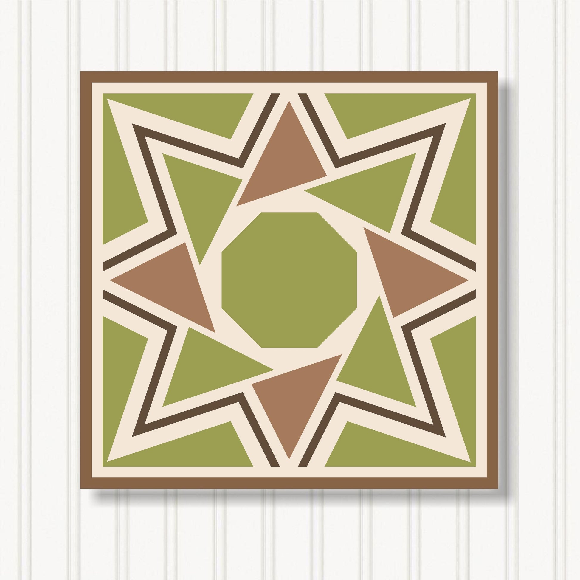 Our indoor barn quilts are crafted from 3/4" particle board which makes them thick and sturdy. The Barn Quilt Indoor Canvas Squares and printed with UV Ink on archival canvas that creates a beautiful satin finish. The canvas is stretched around the board and finished with museum quality edges. We include hangers on the back of our barn quilt canvases for mounting them on the wall.