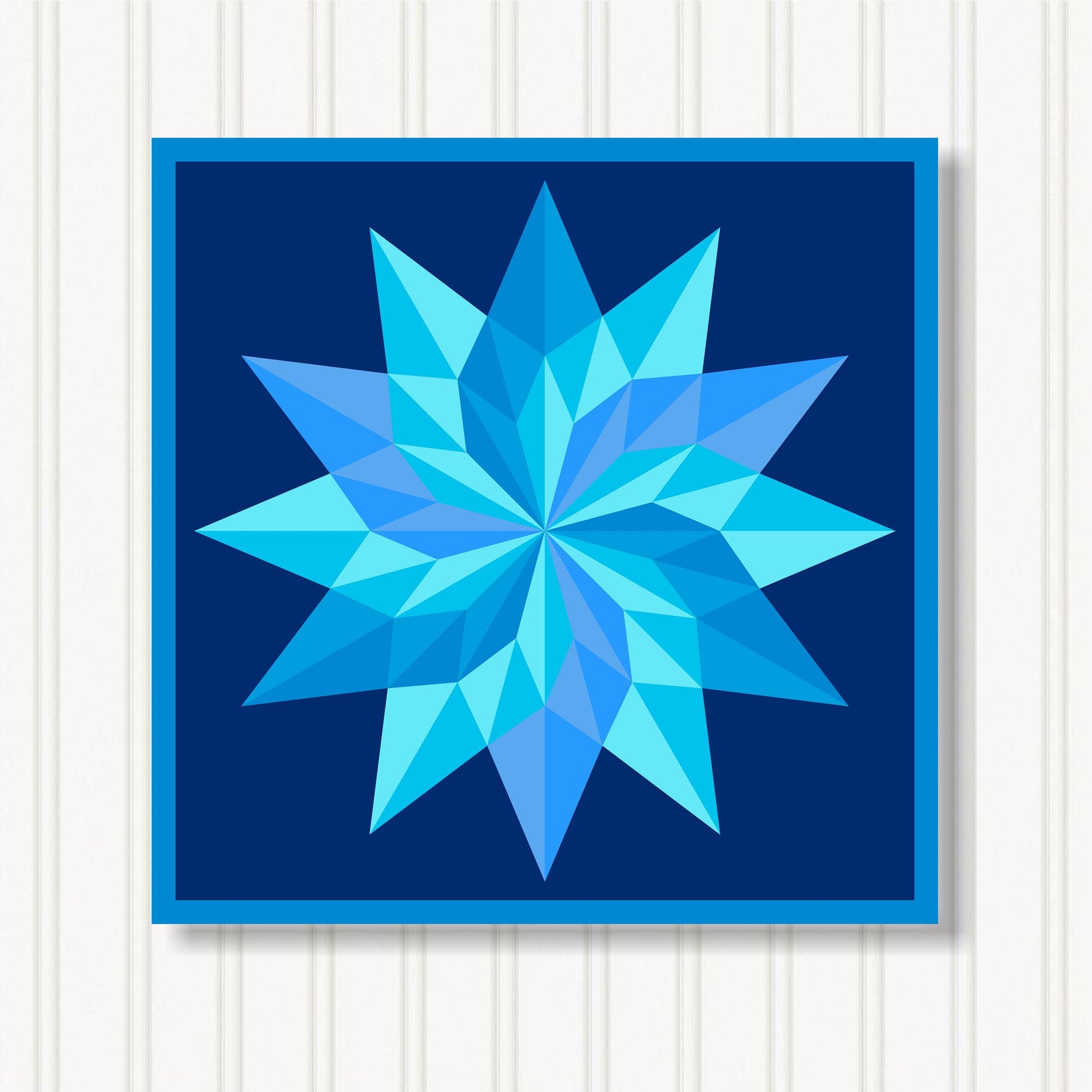 Our indoor barn quilts are crafted from 3/4" particle board which makes them thick and sturdy. The Barn Quilt Indoor Canvas Squares and printed with UV Ink on archival canvas that creates a beautiful satin finish. The canvas is stretched around the board and finished with museum quality edges. We include hangers on the back of our barn quilt canvases for mounting them on the wall.