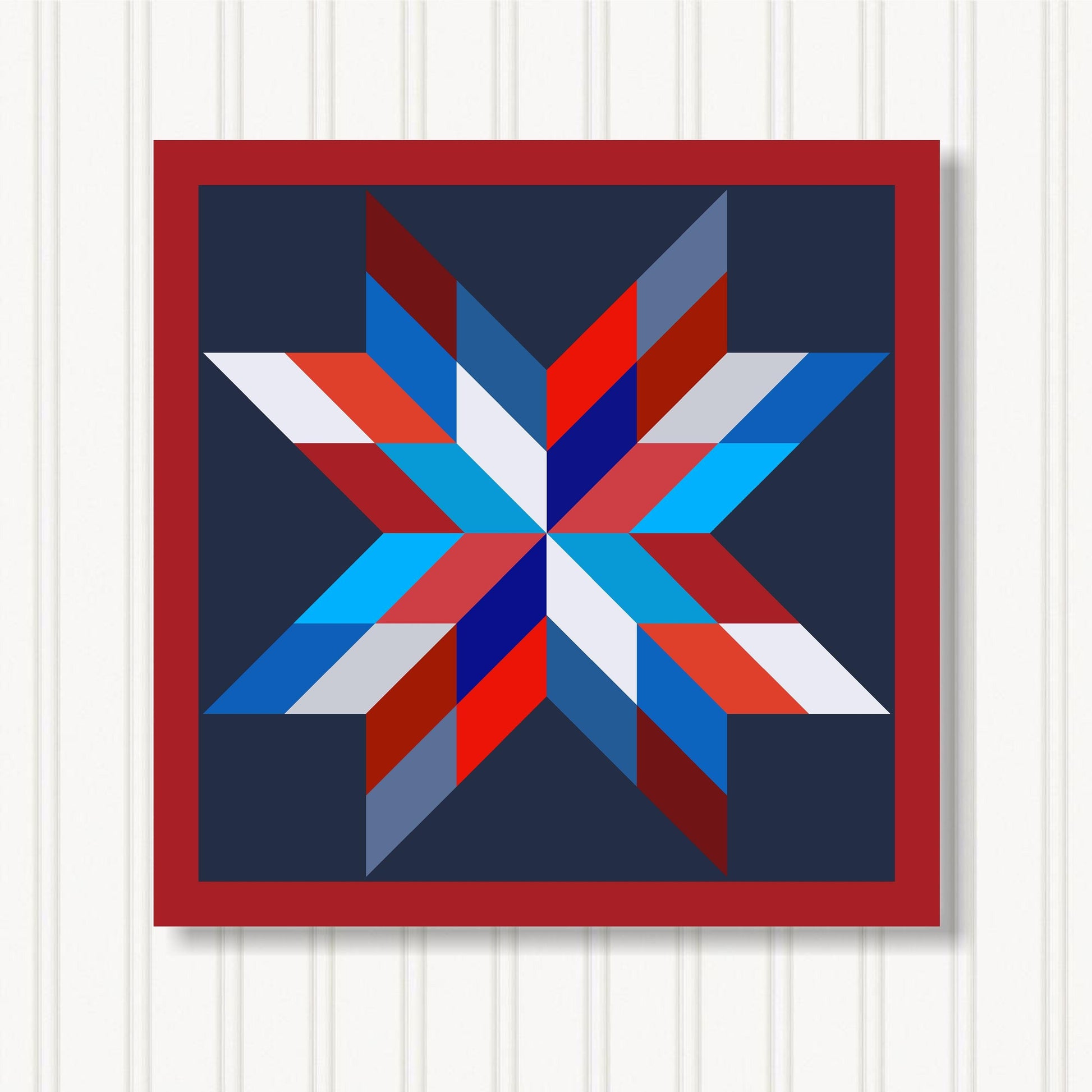 Our indoor barn quilts are crafted from 3/4" particle board which makes them thick and sturdy. The Barn Quilt Indoor Canvas Squares and printed with UV Ink on archival canvas that creates a beautiful satin finish. The canvas is stretched around the board and finished with museum quality edges. We include hangers on the back of our barn quilt canvases for mounting them on the wall.