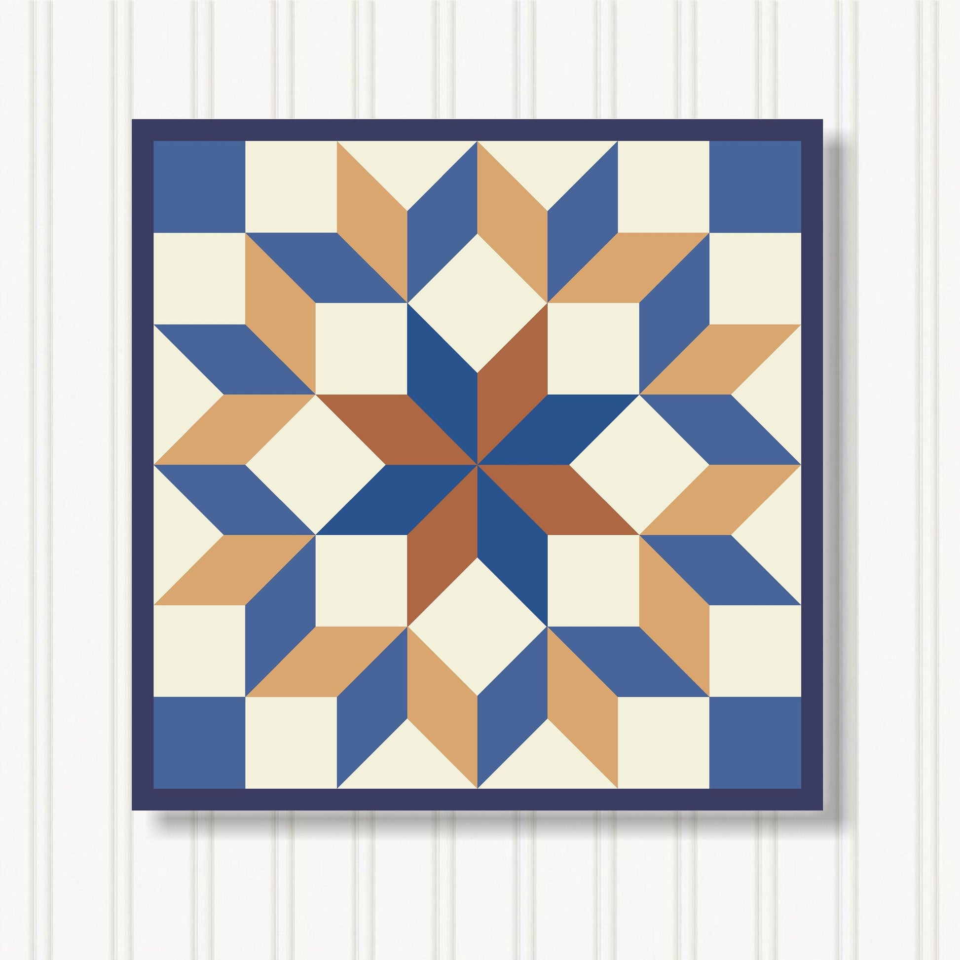 Our indoor barn quilts are crafted from 3/4" particle board which makes them thick and sturdy. The Barn Quilt Indoor Canvas Squares and printed with UV Ink on archival canvas that creates a beautiful satin finish. The canvas is stretched around the board and finished with museum quality edges. We include hangers on the back of our barn quilt canvases for mounting them on the wall.