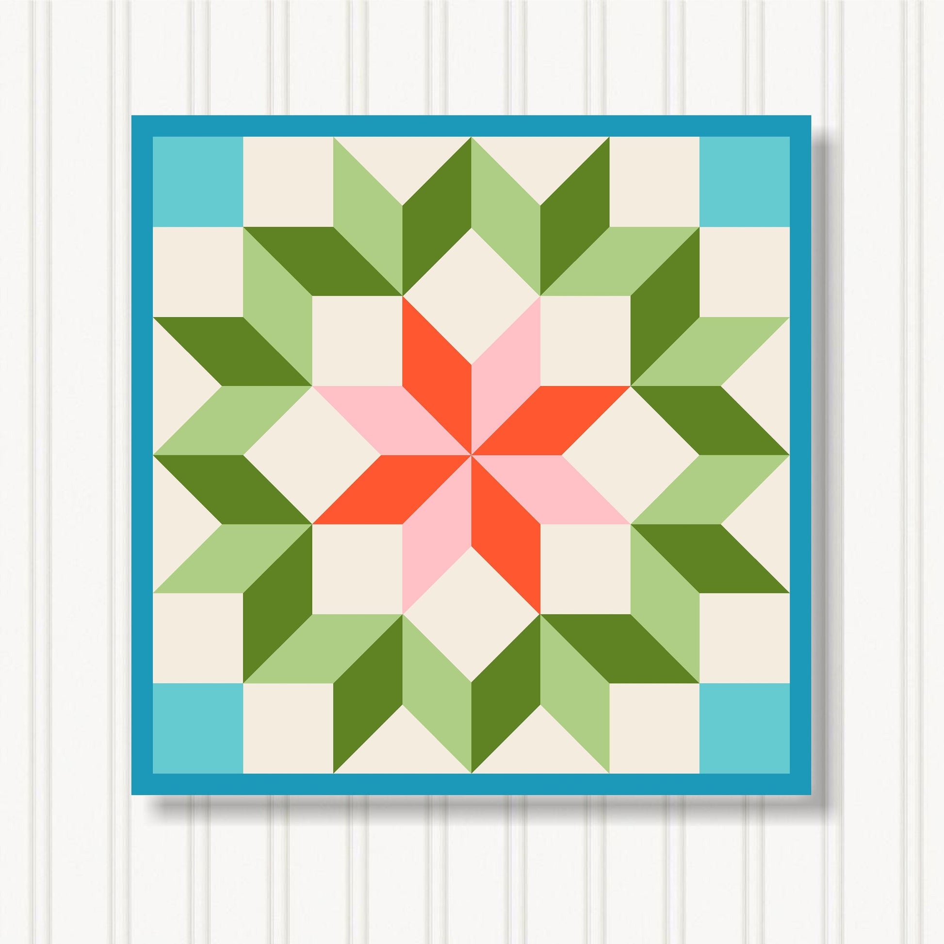 Our indoor barn quilts are crafted from 3/4" particle board which makes them thick and sturdy. The Barn Quilt Indoor Canvas Squares and printed with UV Ink on archival canvas that creates a beautiful satin finish. The canvas is stretched around the board and finished with museum quality edges. We include hangers on the back of our barn quilt canvases for mounting them on the wall.