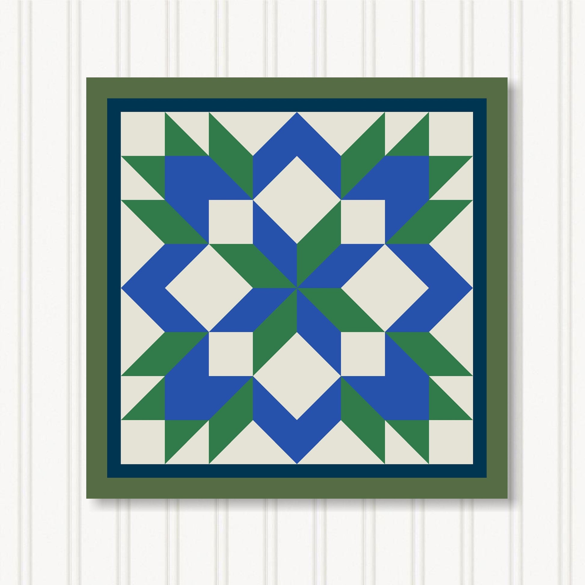 Our indoor barn quilts are crafted from 3/4" particle board which makes them thick and sturdy. The Barn Quilt Indoor Canvas Squares and printed with UV Ink on archival canvas that creates a beautiful satin finish. The canvas is stretched around the board and finished with museum quality edges. We include hangers on the back of our barn quilt canvases for mounting them on the wall.