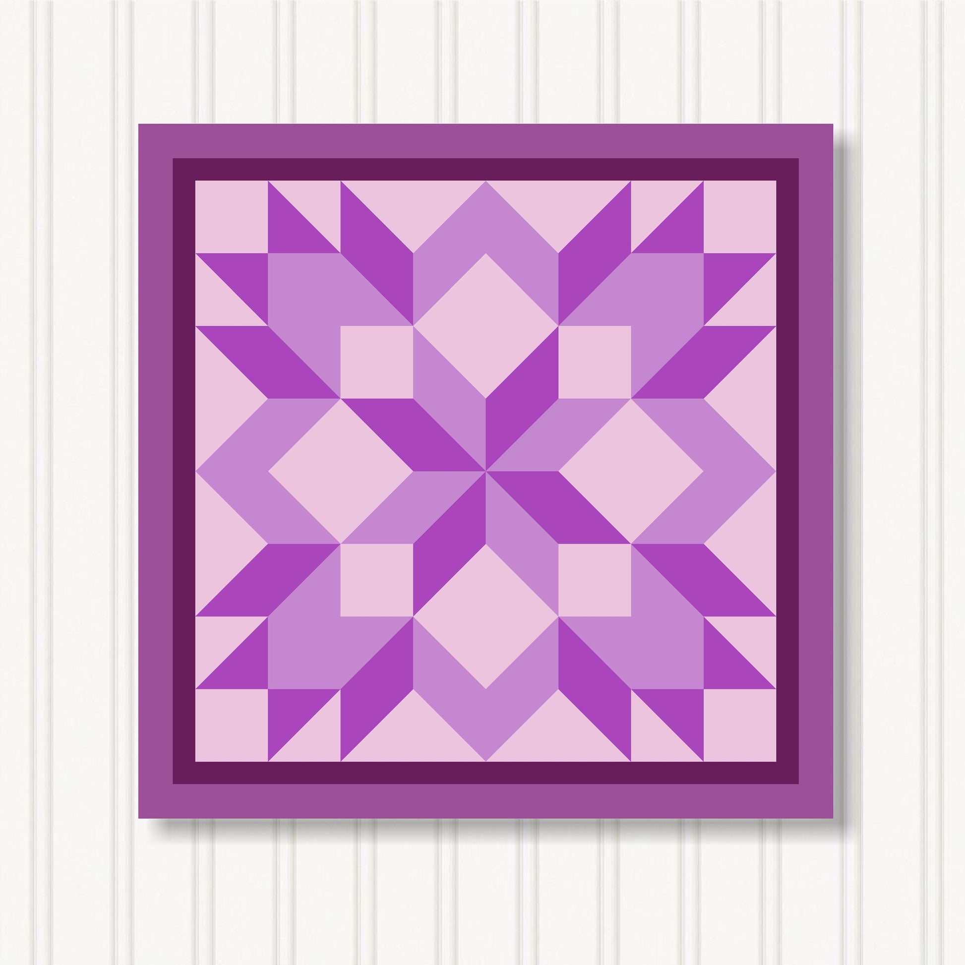 Our indoor barn quilts are crafted from 3/4" particle board which makes them thick and sturdy. The Barn Quilt Indoor Canvas Squares and printed with UV Ink on archival canvas that creates a beautiful satin finish. The canvas is stretched around the board and finished with museum quality edges. We include hangers on the back of our barn quilt canvases for mounting them on the wall.