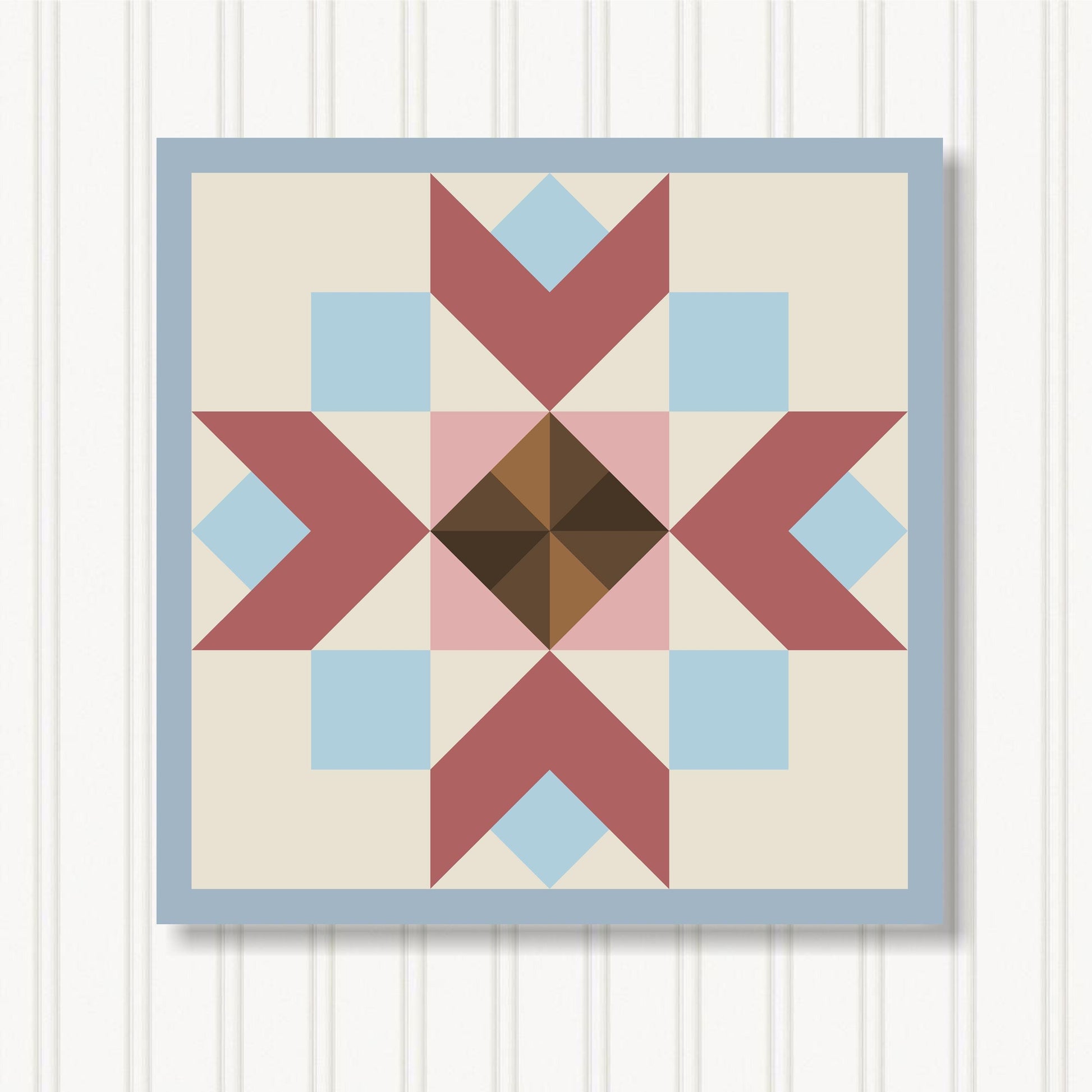 Our indoor barn quilts are crafted from 3/4" particle board which makes them thick and sturdy. The Barn Quilt Indoor Canvas Squares and printed with UV Ink on archival canvas that creates a beautiful satin finish. The canvas is stretched around the board and finished with museum quality edges. We include hangers on the back of our barn quilt canvases for mounting them on the wall.